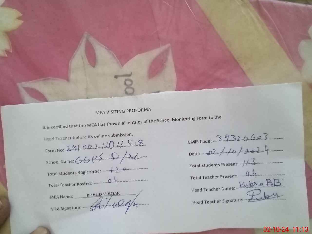 | Certified that this School was Inspected by the Undersigned MEA/DMO Today and the Information Stated Above is as Per Record. | |||||