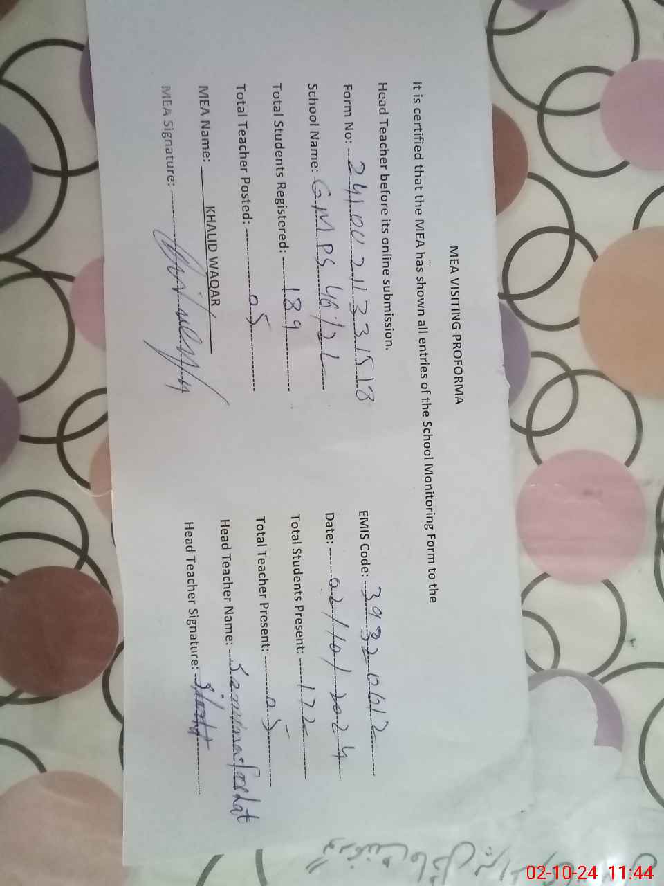 | Certified that this School was Inspected by the Undersigned MEA/DMO Today and the Information Stated Above is as Per Record. | |||||