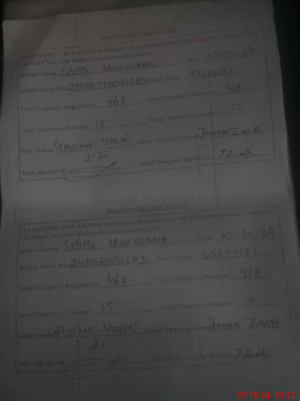 | Monitoring Date: 07-10-2024 | Start Time: 07-10-2024 09:23 AM | End Time: 07-10-2024 10:13 AM | Name of MEA: J-**** GH**** YA**** | |