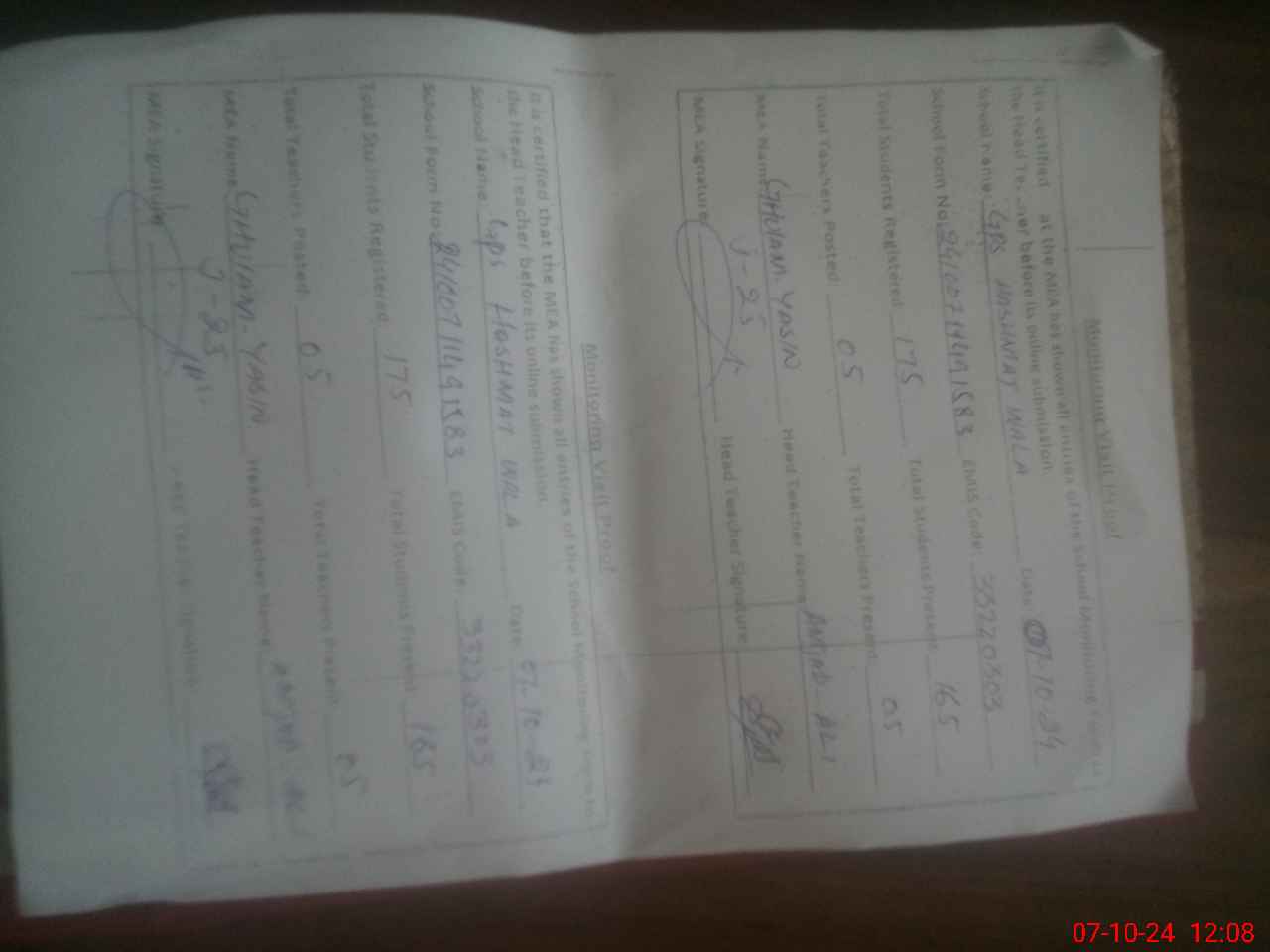 | Certified that this School was Inspected by the Undersigned MEA/DMO Today and the Information Stated Above is as Per Record. | |||||
