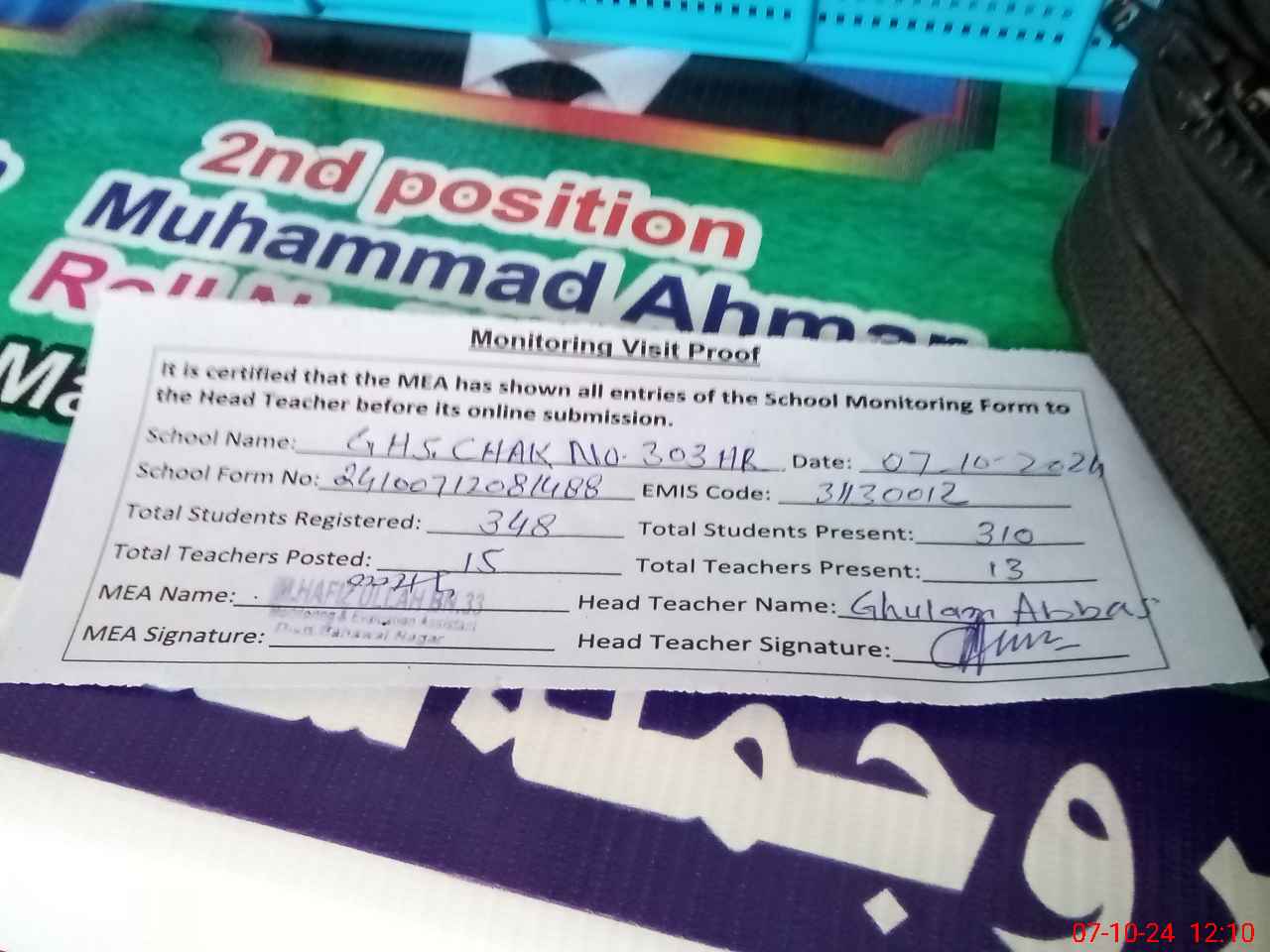 | Certified that this School was Inspected by the Undersigned MEA/DMO Today and the Information Stated Above is as Per Record. | |||||