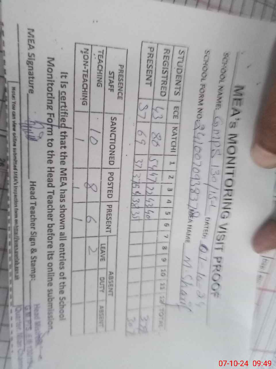 | Attendance Register | Head Teacher | MEA with School | Visit Proof |