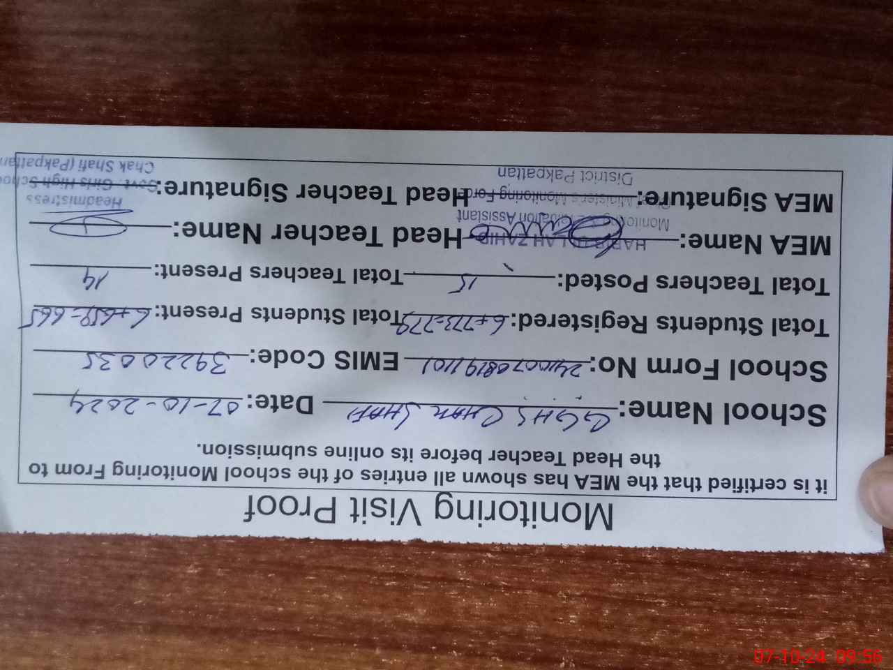 | Certified that this School was Inspected by the Undersigned MEA/DMO Today and the Information Stated Above is as Per Record. | |||||