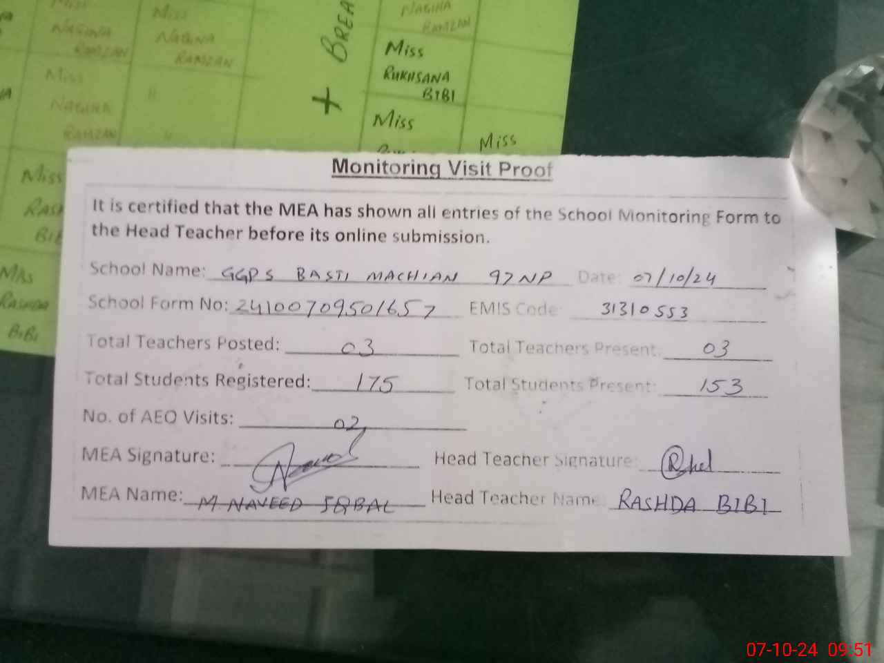 | Monitoring Date: 07-10-2024 | Start Time: 07-10-2024 09:35 AM | End Time: 07-10-2024 09:53 AM | Name of MEA: Mu**** Na**** Iq**** | |
