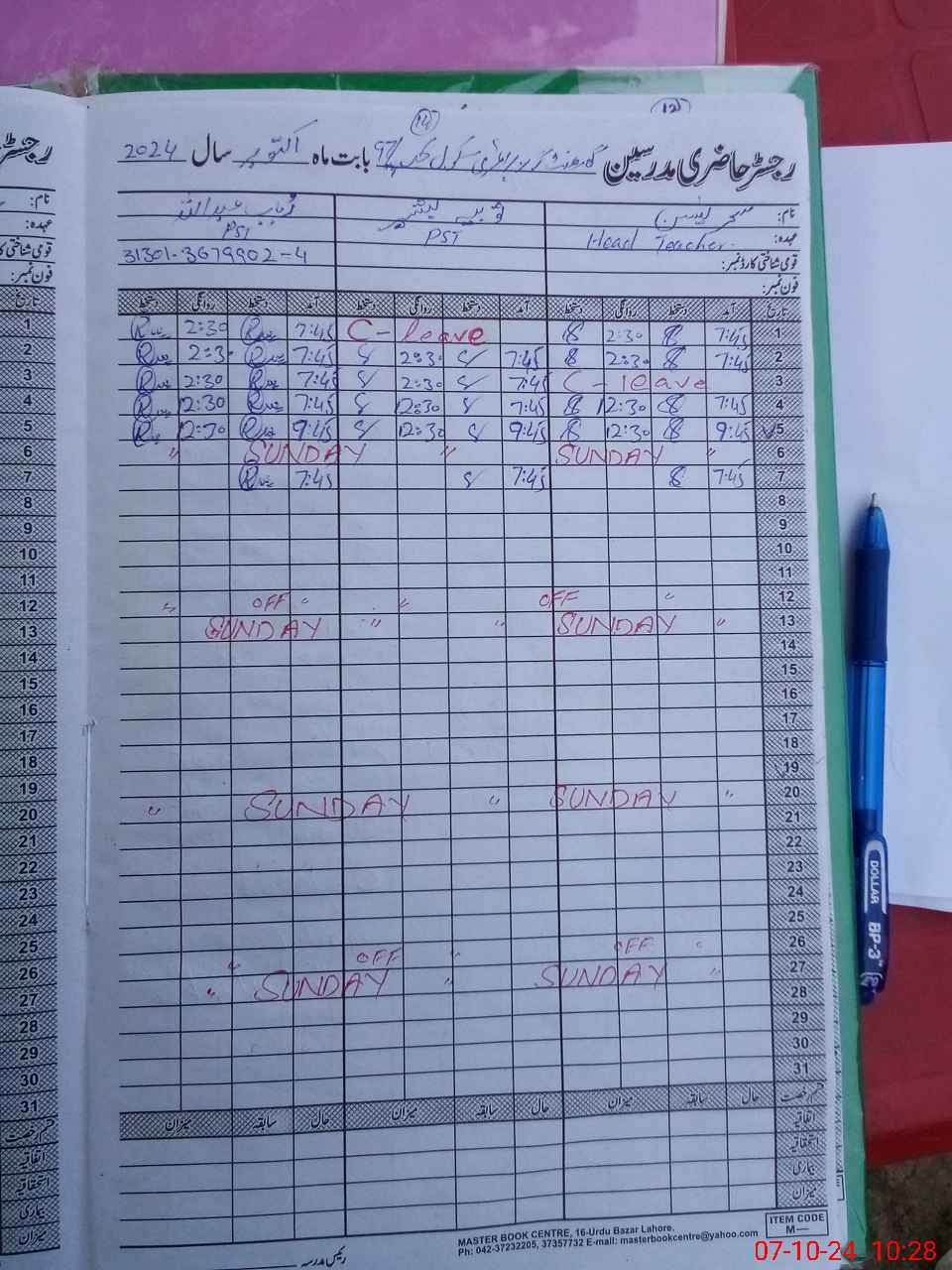 | CNIC | Full Name | Designation | R/C | Absence During Last Calender Month |