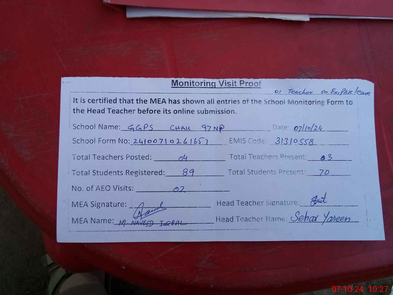 | Attendance Register | Head Teacher | MEA with School | Visit Proof |