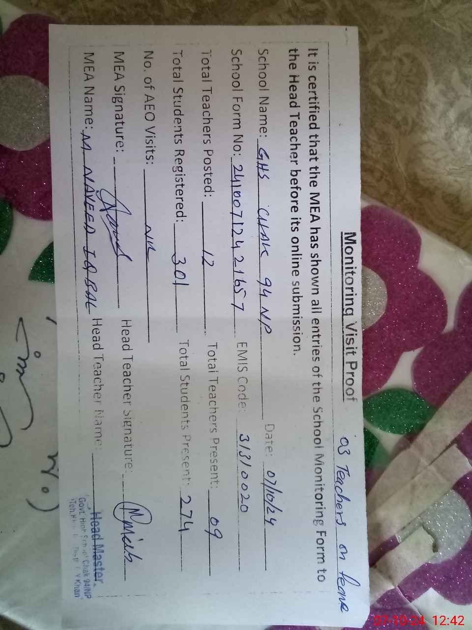 | Attendance Register | Head Teacher | MEA with School | Visit Proof |