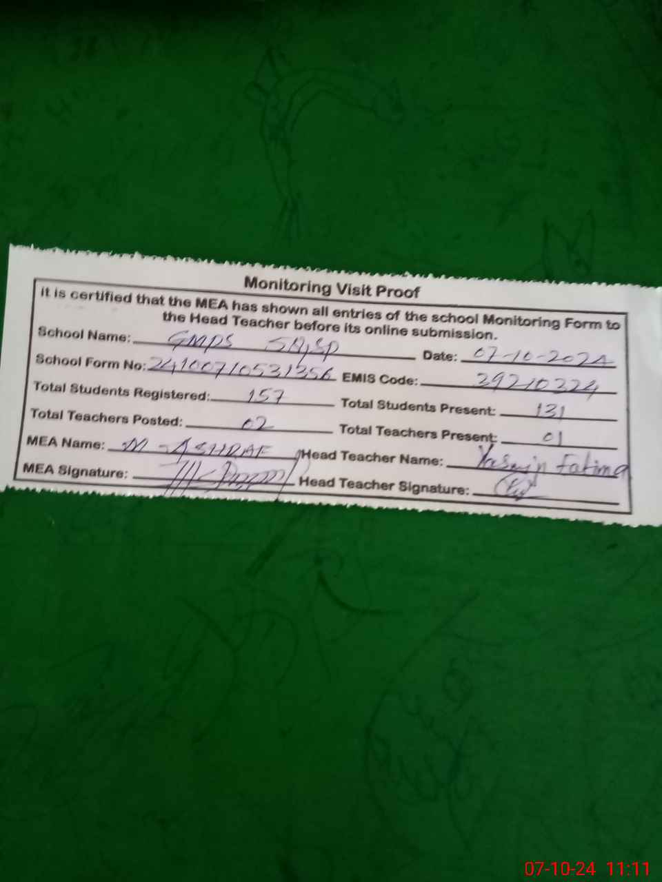 | Attendance Register | Head Teacher | MEA with School | Visit Proof |