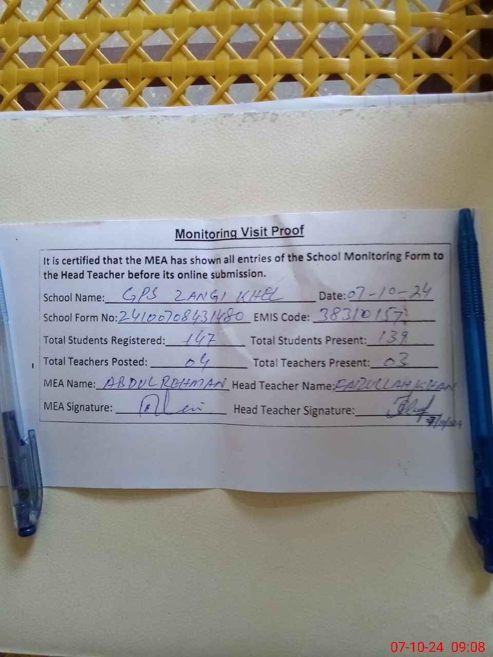 | EMIS Code: 38310157 | Name of School: GPS ZANGHI KHEL | |||