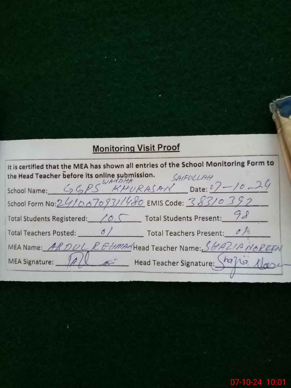 | EMIS Code: 38310392 | Name of School: GGPS WANDHA KHURASAN SAIF ULLAH | |||