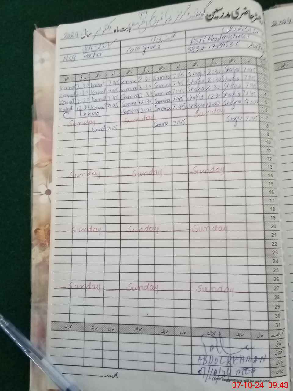 | CNIC | Full Name | Designation | R/C | Absence During Last Calender Month |