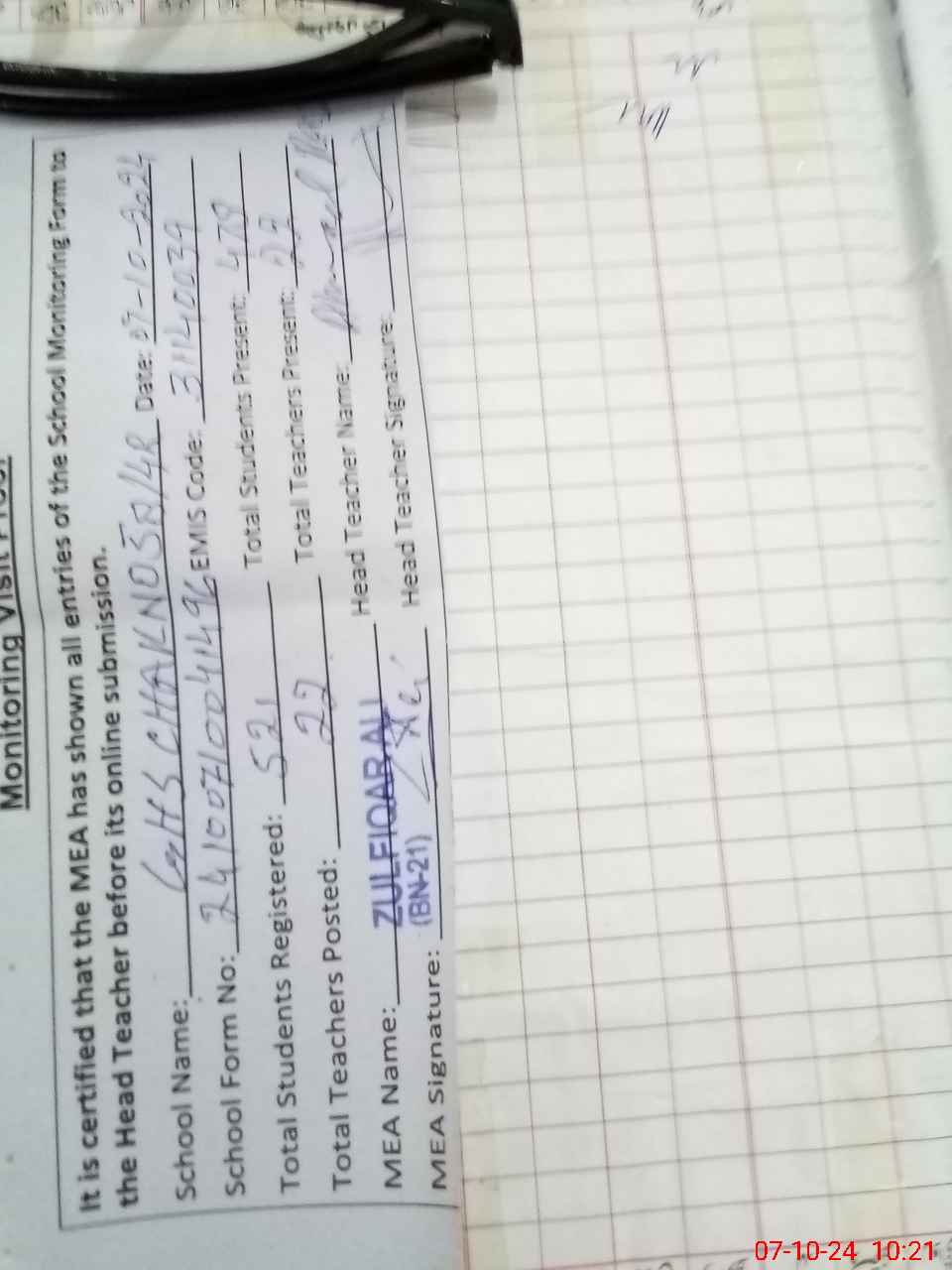 | Monitoring Date: 07-10-2024 | Start Time: 07-10-2024 09:36 AM | End Time: 07-10-2024 10:28 AM | Name of MEA: Zu**** Al**** BN**** | |