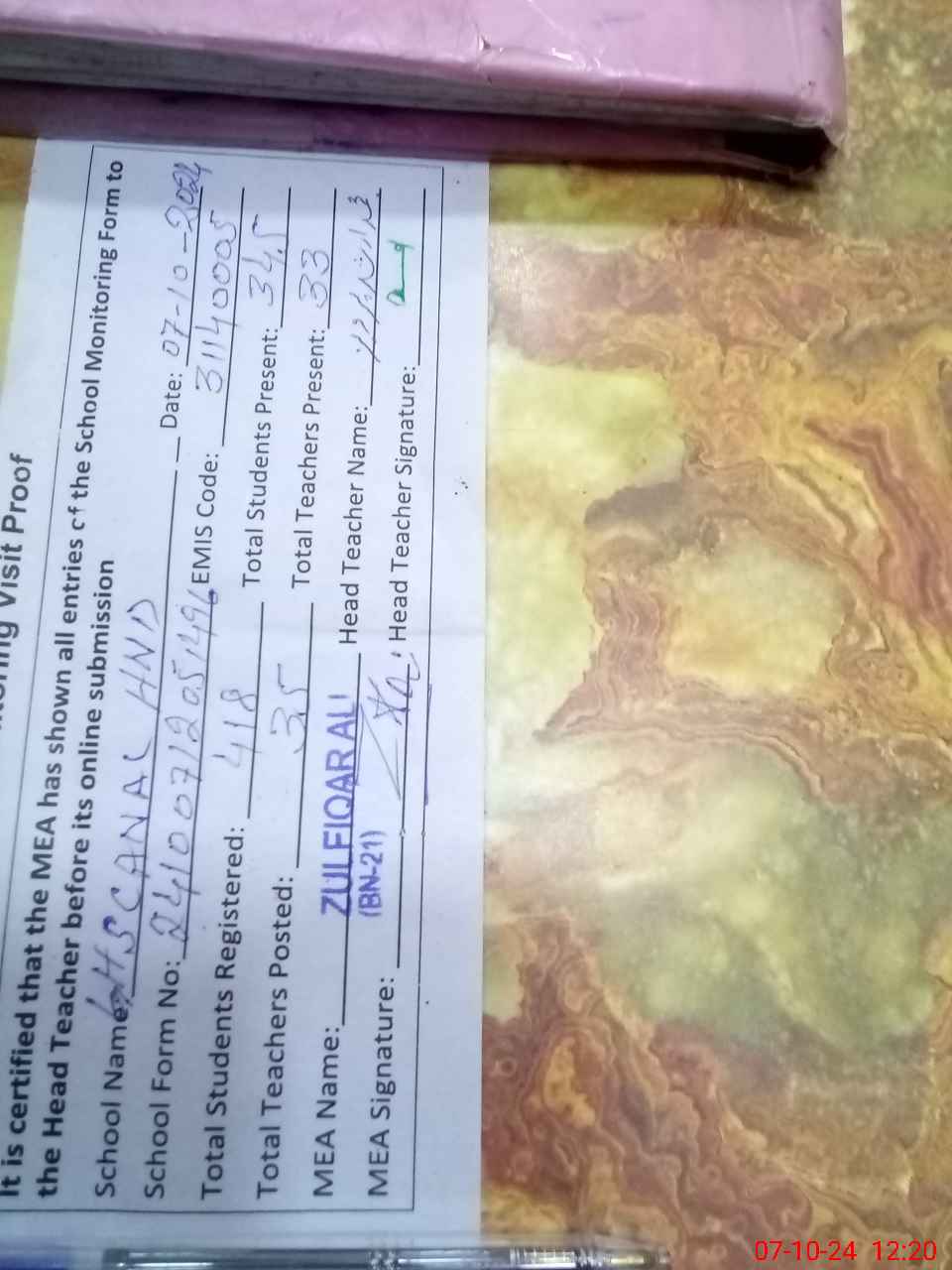 | Certified that this School was Inspected by the Undersigned MEA/DMO Today and the Information Stated Above is as Per Record. | |||||