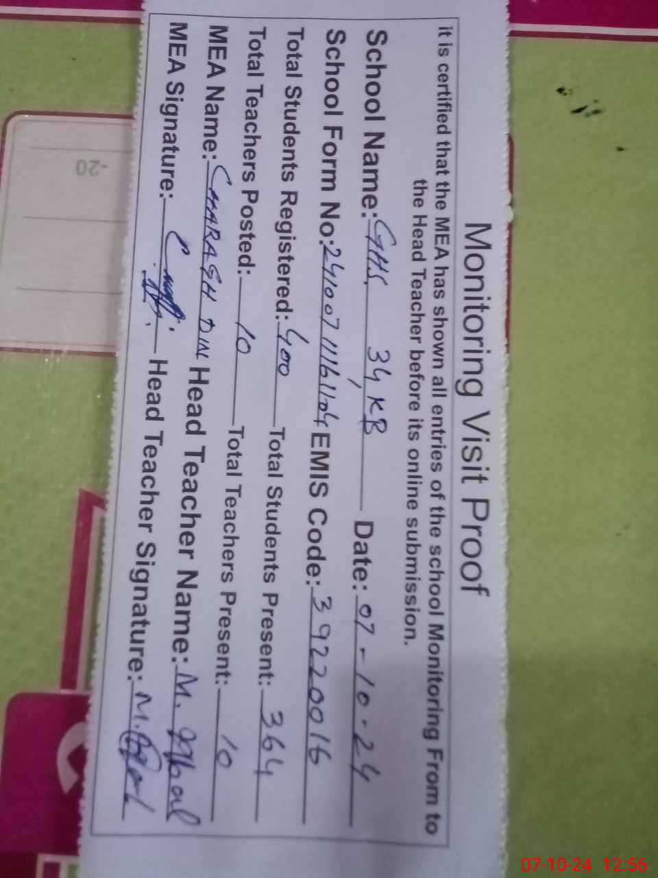 | EMIS Code: 39220016 | Name of School: GHS CHAK NO.34/KB | |||