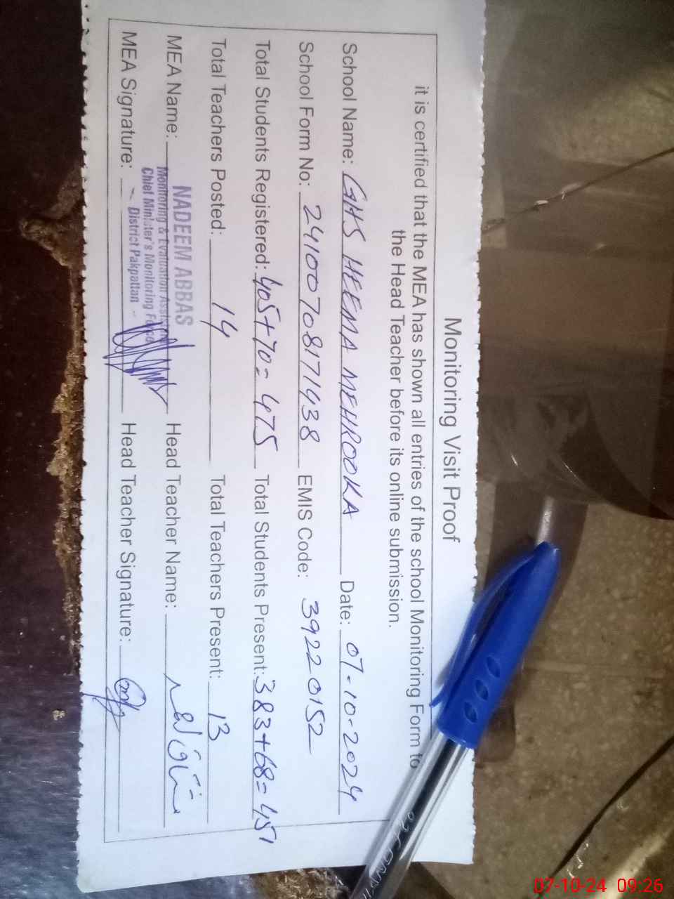 | Certified that this School was Inspected by the Undersigned MEA/DMO Today and the Information Stated Above is as Per Record. | |||||