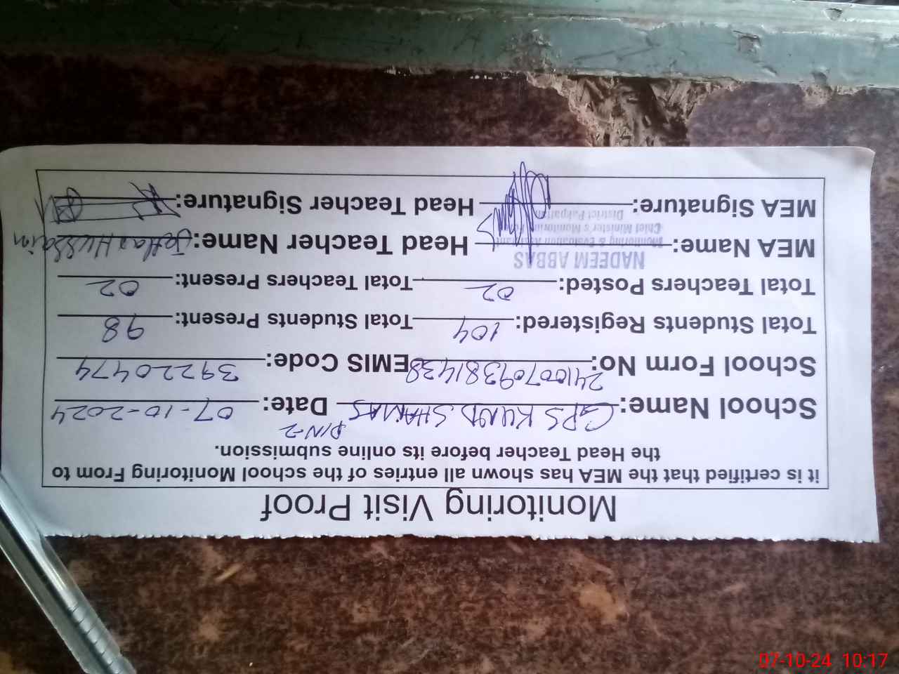 | Certified that this School was Inspected by the Undersigned MEA/DMO Today and the Information Stated Above is as Per Record. | |||||