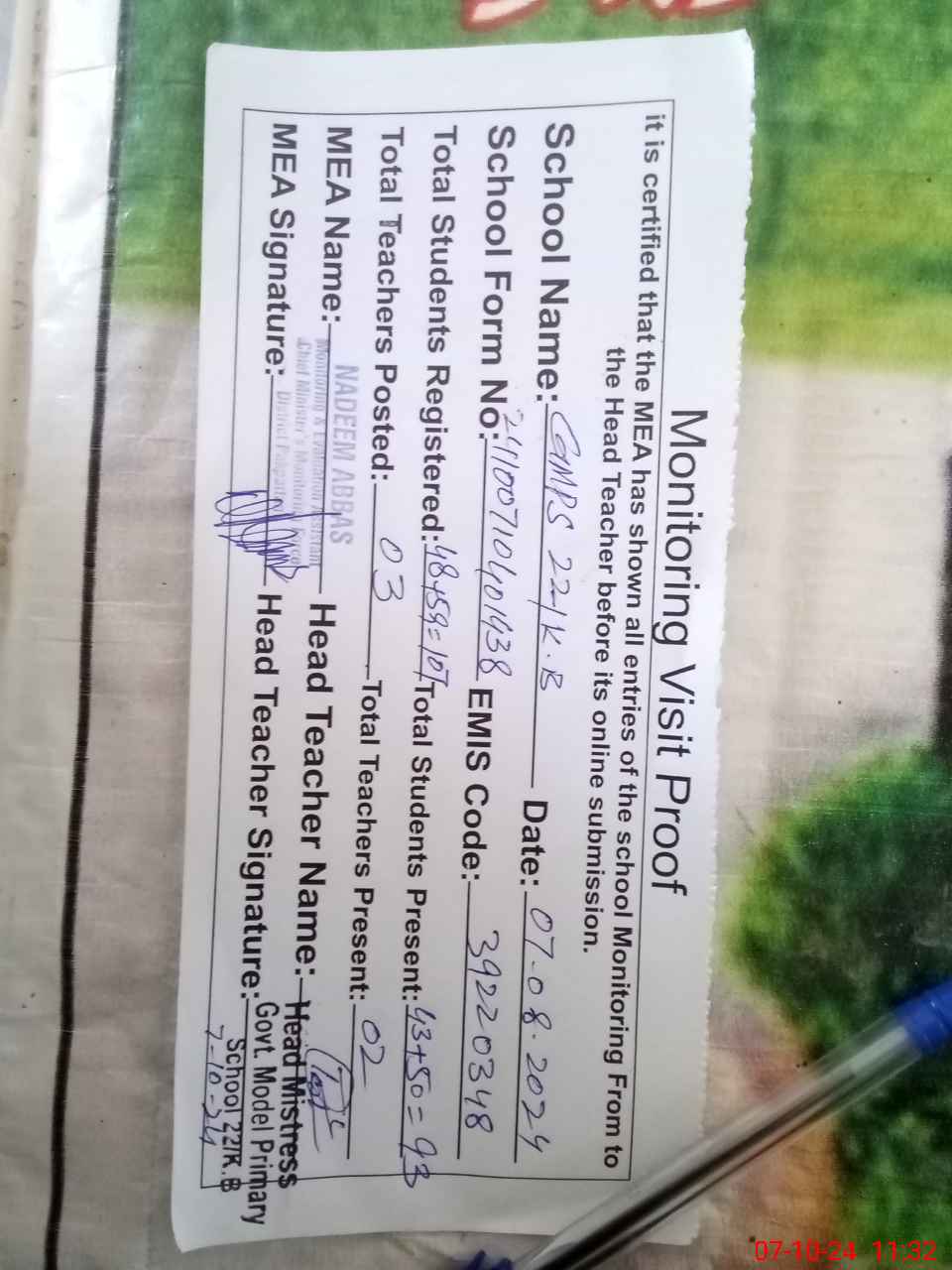 | Certified that this School was Inspected by the Undersigned MEA/DMO Today and the Information Stated Above is as Per Record. | |||||
