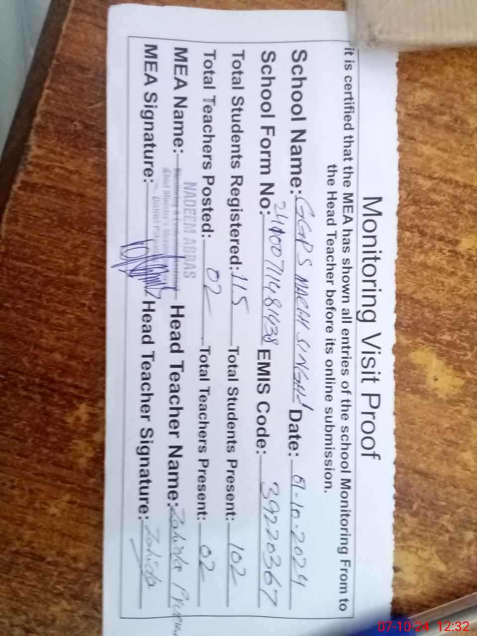 | Certified that this School was Inspected by the Undersigned MEA/DMO Today and the Information Stated Above is as Per Record. | |||||
