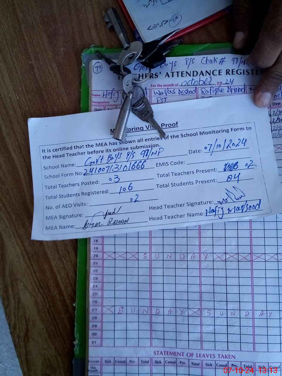 | Attendance Register | Head Teacher | MEA with School | Visit Proof |
