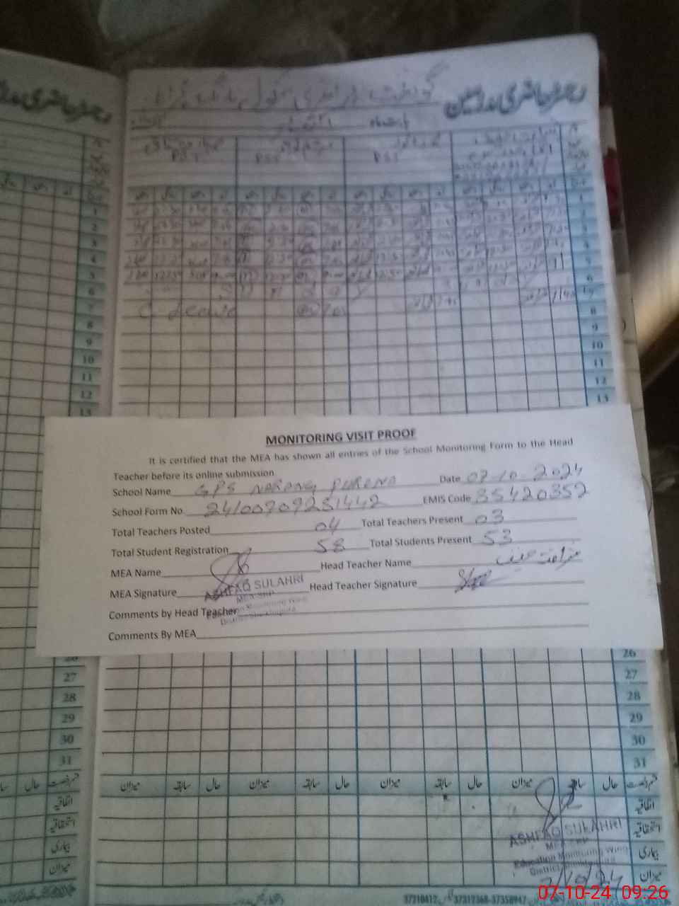 | Attendance Register | Head Teacher | MEA with School | Visit Proof |