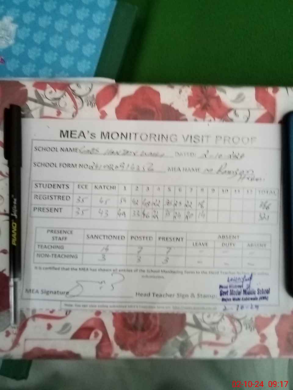| Attendance Register | Head Teacher | MEA with School | Visit Proof |