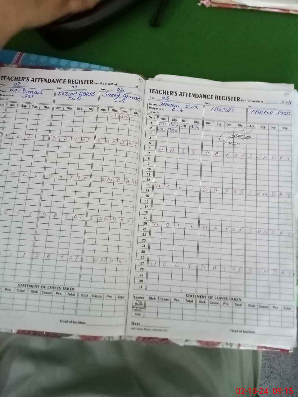 | CNIC | Full Name | Designation | R/C | Absence During Last Calender Month |