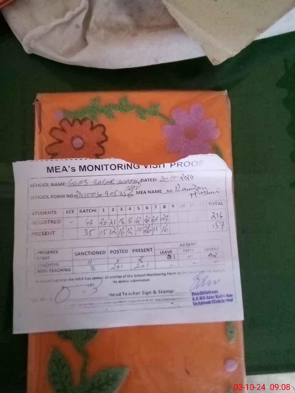 | Attendance Register | Head Teacher | MEA with School | Visit Proof |