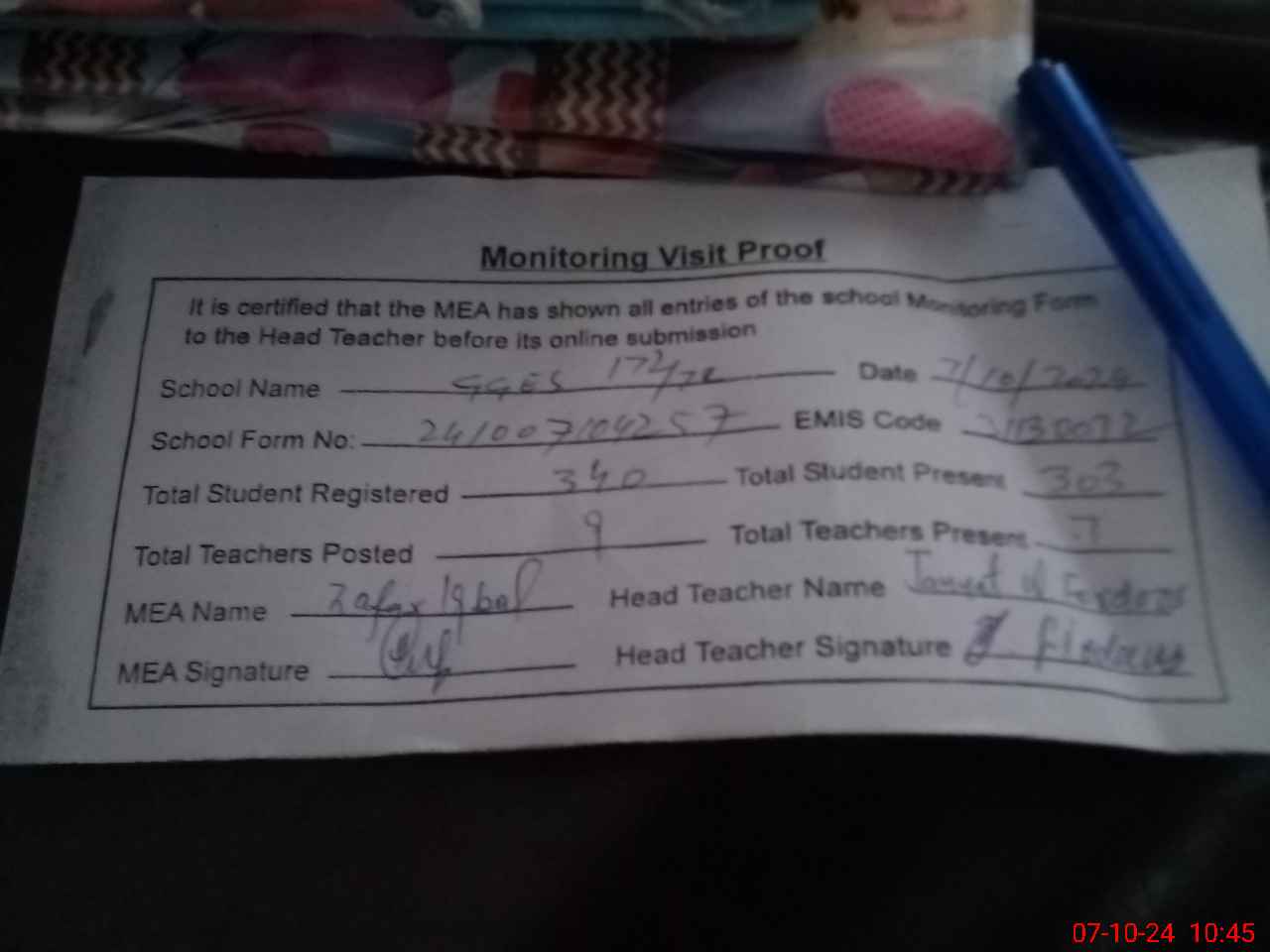 | Monitoring Date: 07-10-2024 | Start Time: 07-10-2024 10:12 AM | End Time: 07-10-2024 10:45 AM | Name of MEA: Za**** Iq**** BN**** | |