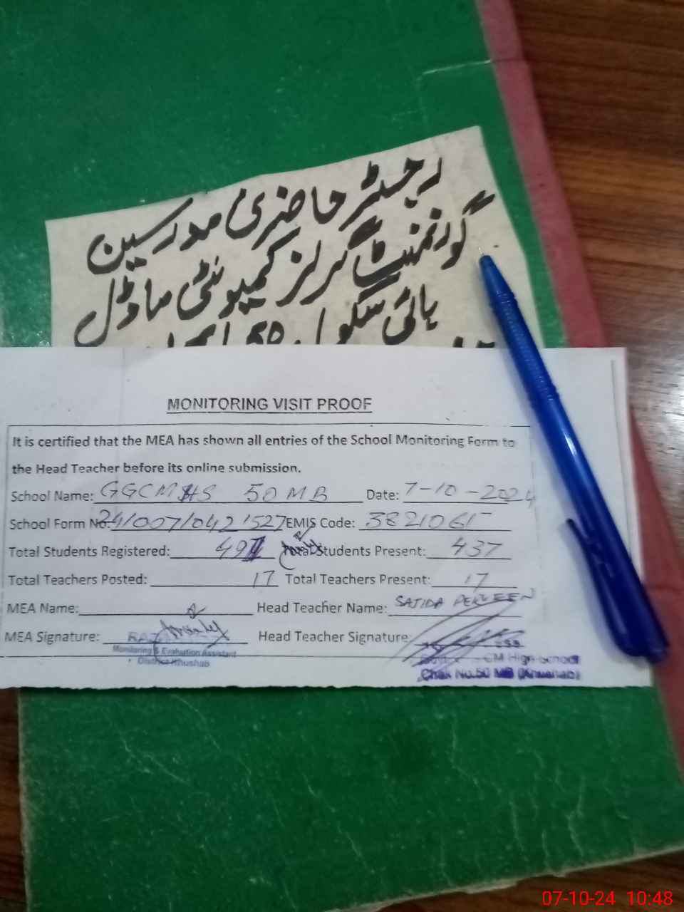 | Attendance Register | Head Teacher | MEA with School | Visit Proof |