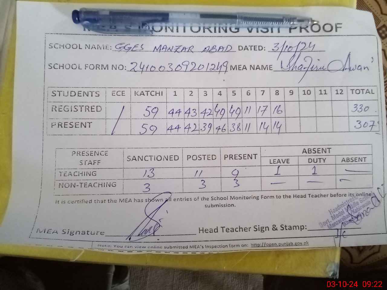 | Attendance Register | Head Teacher | MEA with School | Visit Proof |