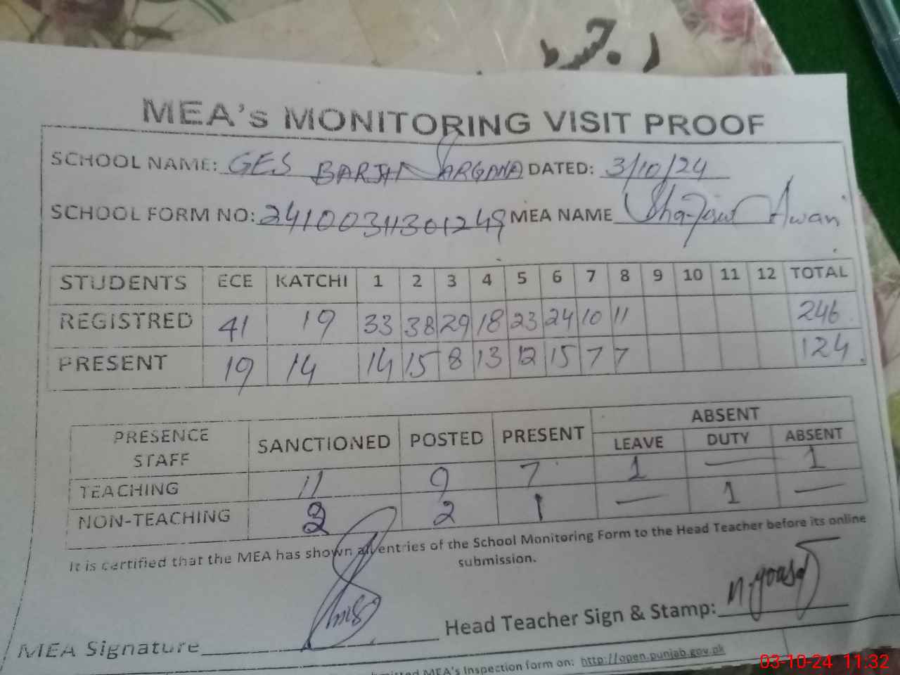 | Attendance Register | Head Teacher | MEA with School | Visit Proof |