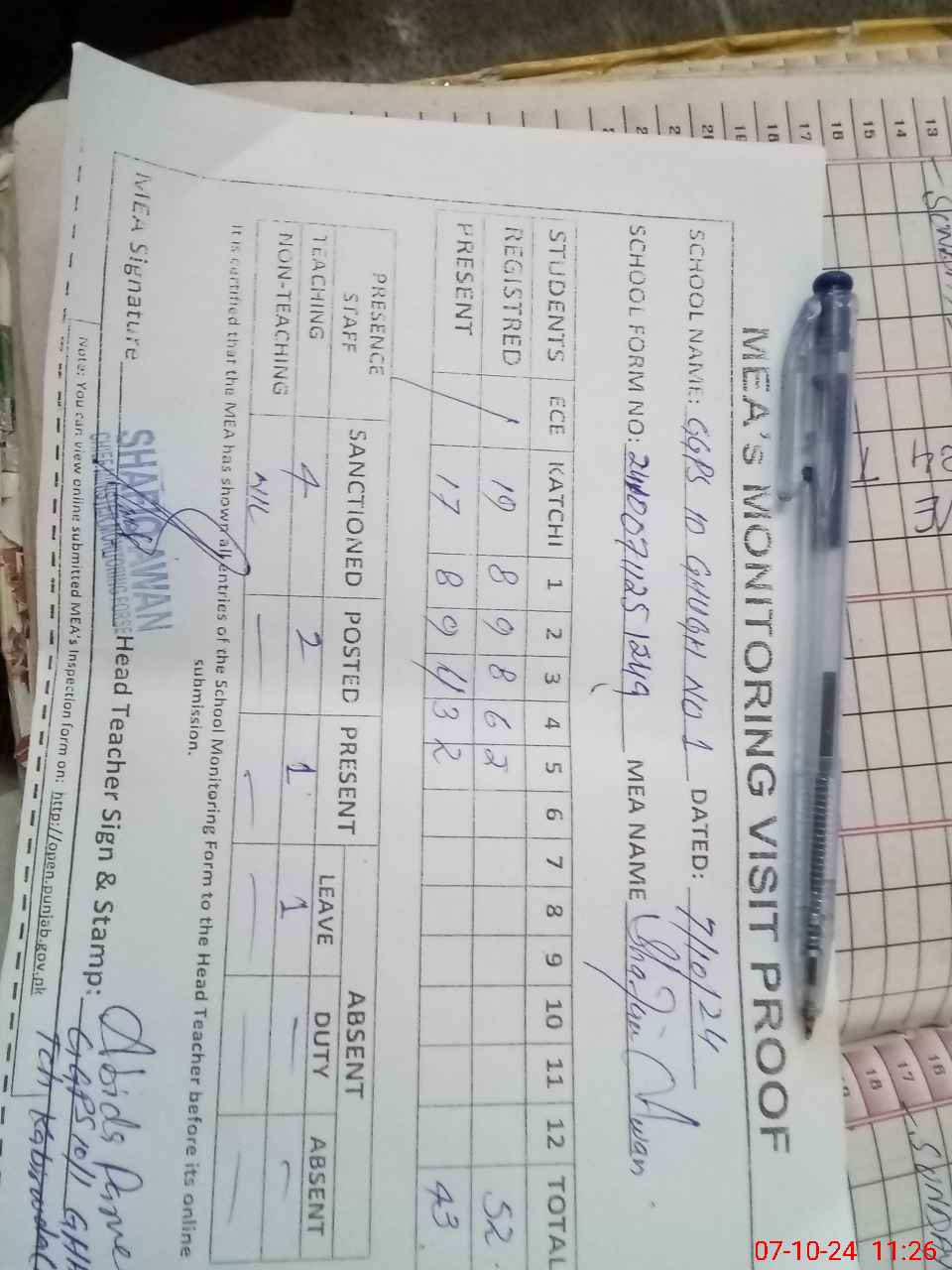 | Attendance Register | Head Teacher | MEA with School | Visit Proof |