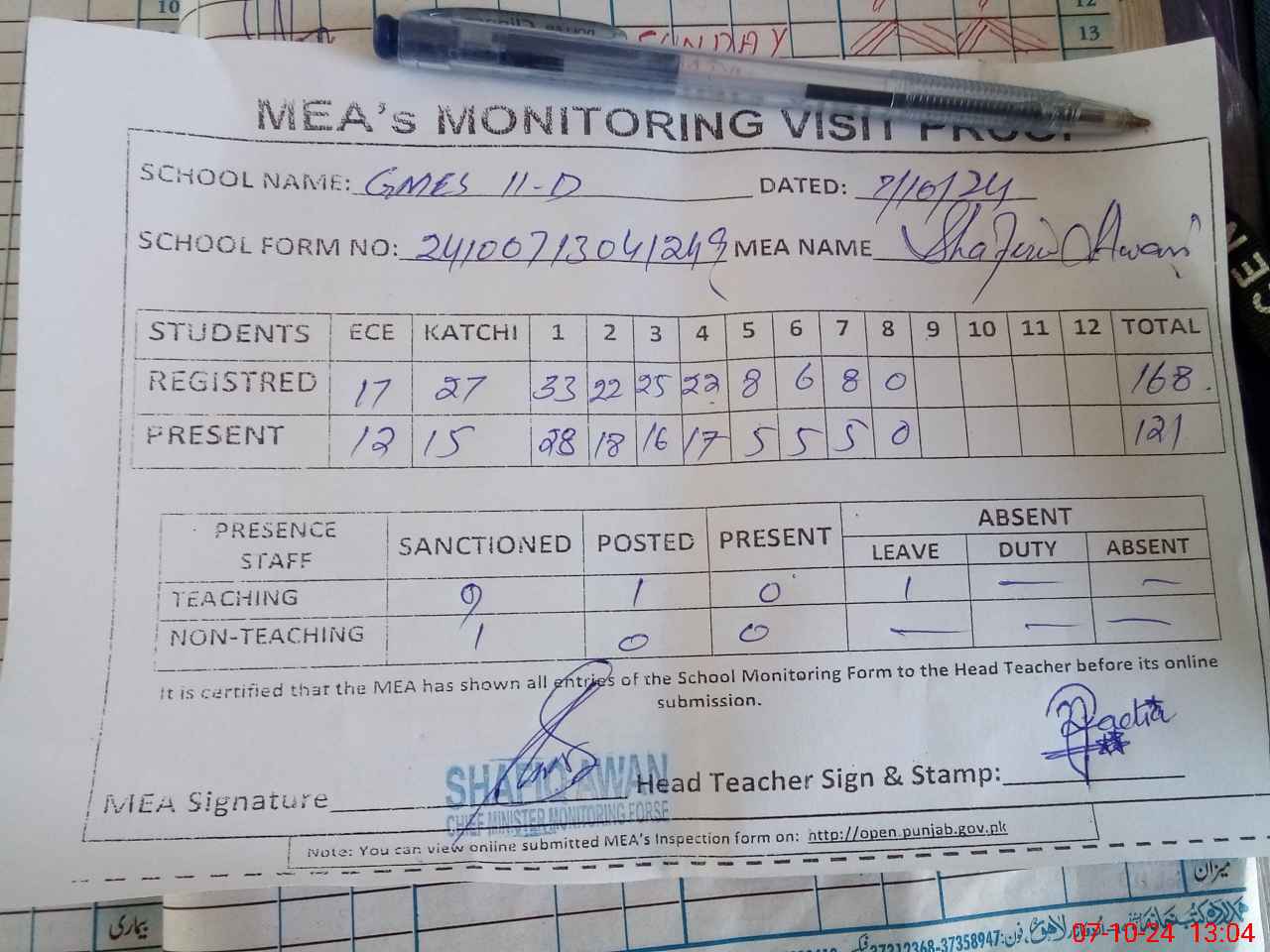 | Attendance Register | Head Teacher | MEA with School | Visit Proof |