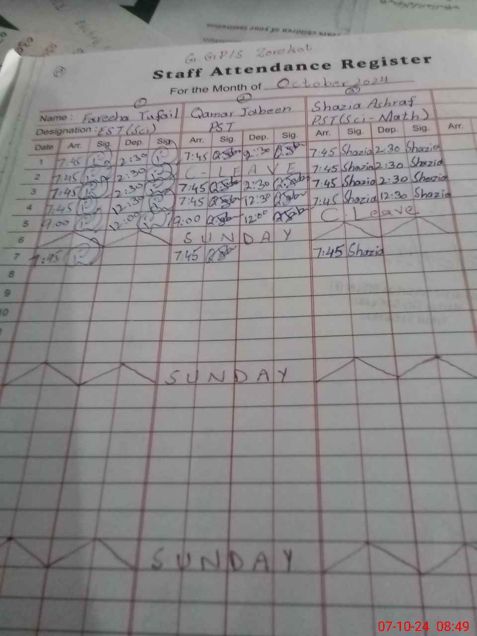 | CNIC | Full Name | Designation | R/C | Absence During Last Calender Month |