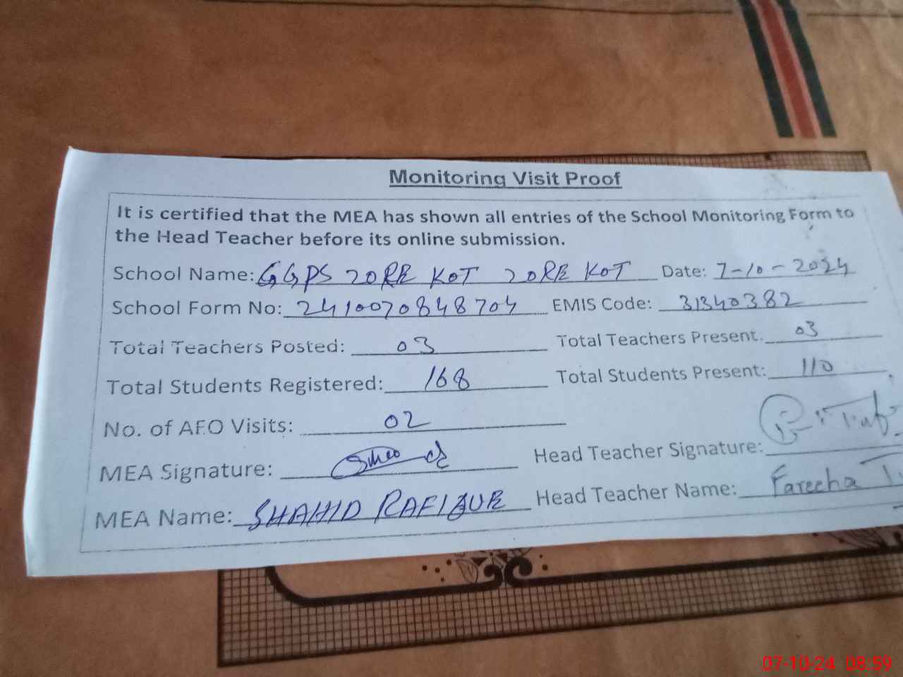 | Certified that this School was Inspected by the Undersigned MEA/DMO Today and the Information Stated Above is as Per Record. | |||||