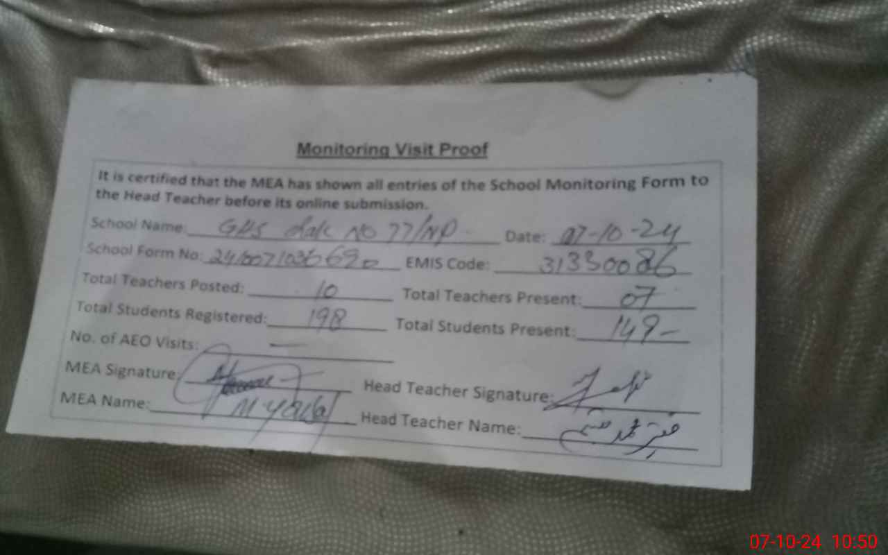 | EMIS Code: 31330086 | Name of School: GHS CHAK 77/NP | |||