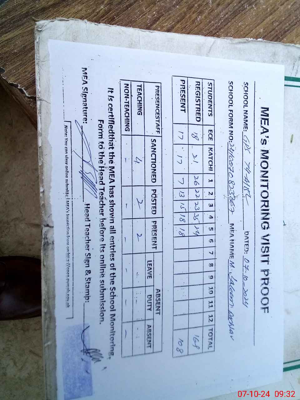 | Attendance Register | Head Teacher | MEA with School | Visit Proof |