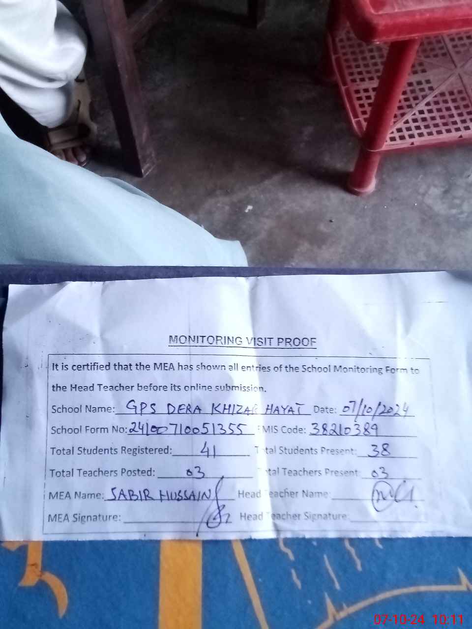 | EMIS Code: 38210389 | Name of School: GPS DERA KHIZAR HAYAT | |||