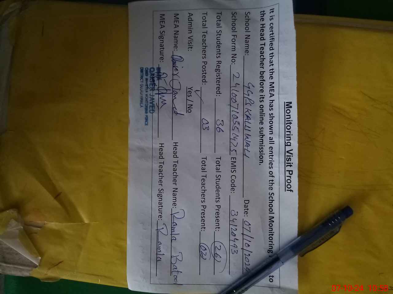 | Attendance Register | Head Teacher | MEA with School | Visit Proof |