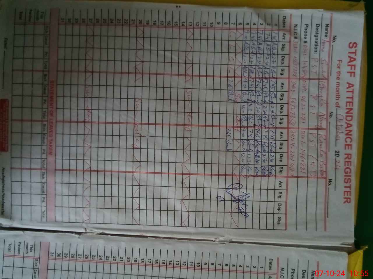 | Remarks (Use Separate Page if Required): According to teacher attendance register PST Teacher ASMA SHAHID is on C Leave but leave is not online applied | |||||