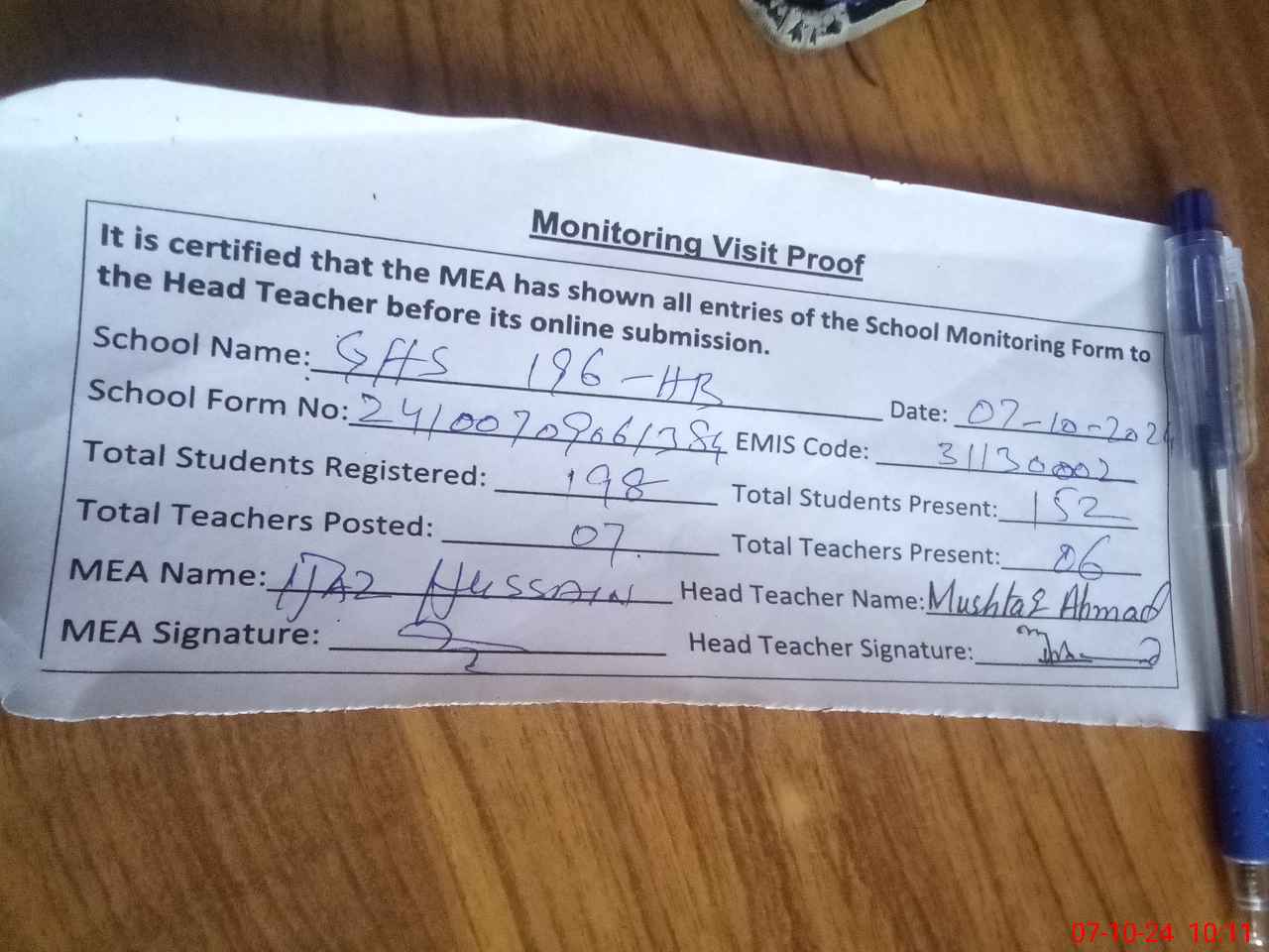| Certified that this School was Inspected by the Undersigned MEA/DMO Today and the Information Stated Above is as Per Record. | |||||