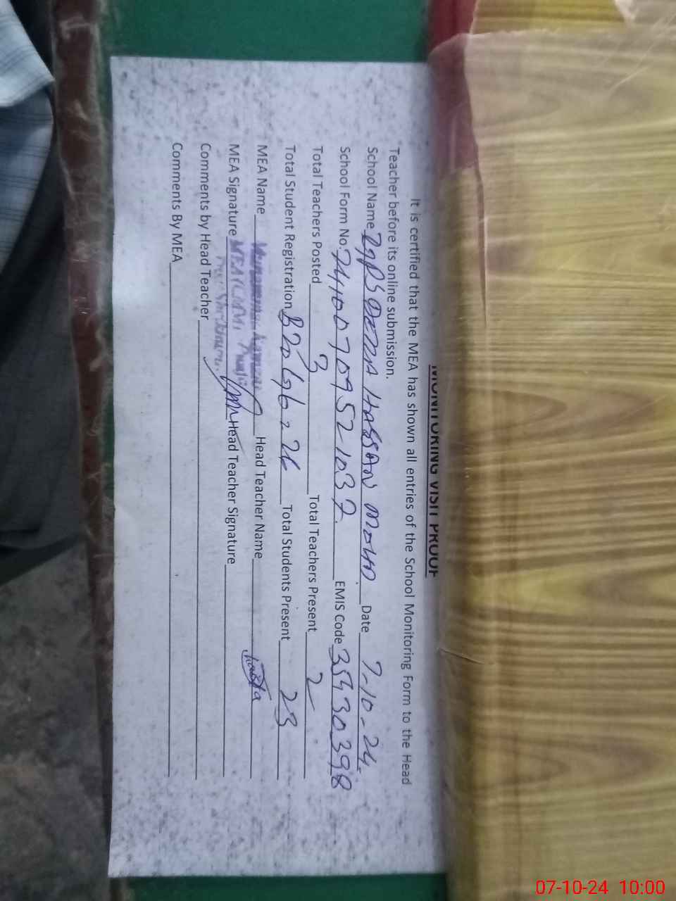 | Attendance Register | Head Teacher | MEA with School | Visit Proof |