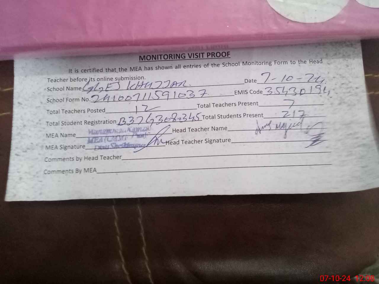 | Attendance Register | Head Teacher | MEA with School | Visit Proof |
