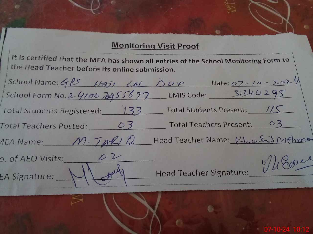 | Attendance Register | Head Teacher | MEA with School | Visit Proof |