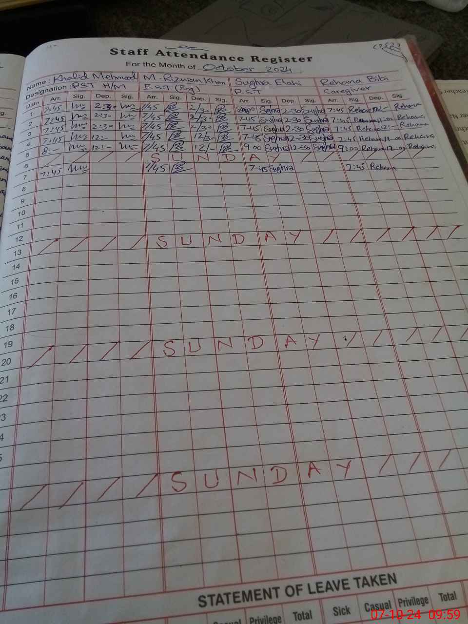 | CNIC | Full Name | Designation | R/C | Absence During Last Calender Month |