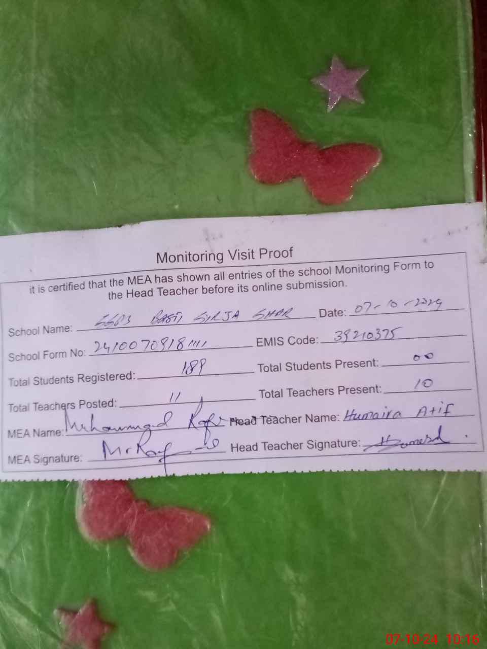 | Certified that this School was Inspected by the Undersigned MEA/DMO Today and the Information Stated Above is as Per Record. | |||||