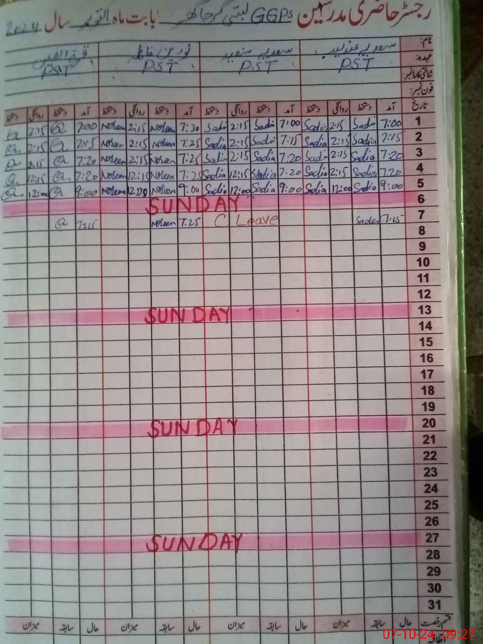 | CNIC | Full Name | Designation | R/C | Absence During Last Calender Month |