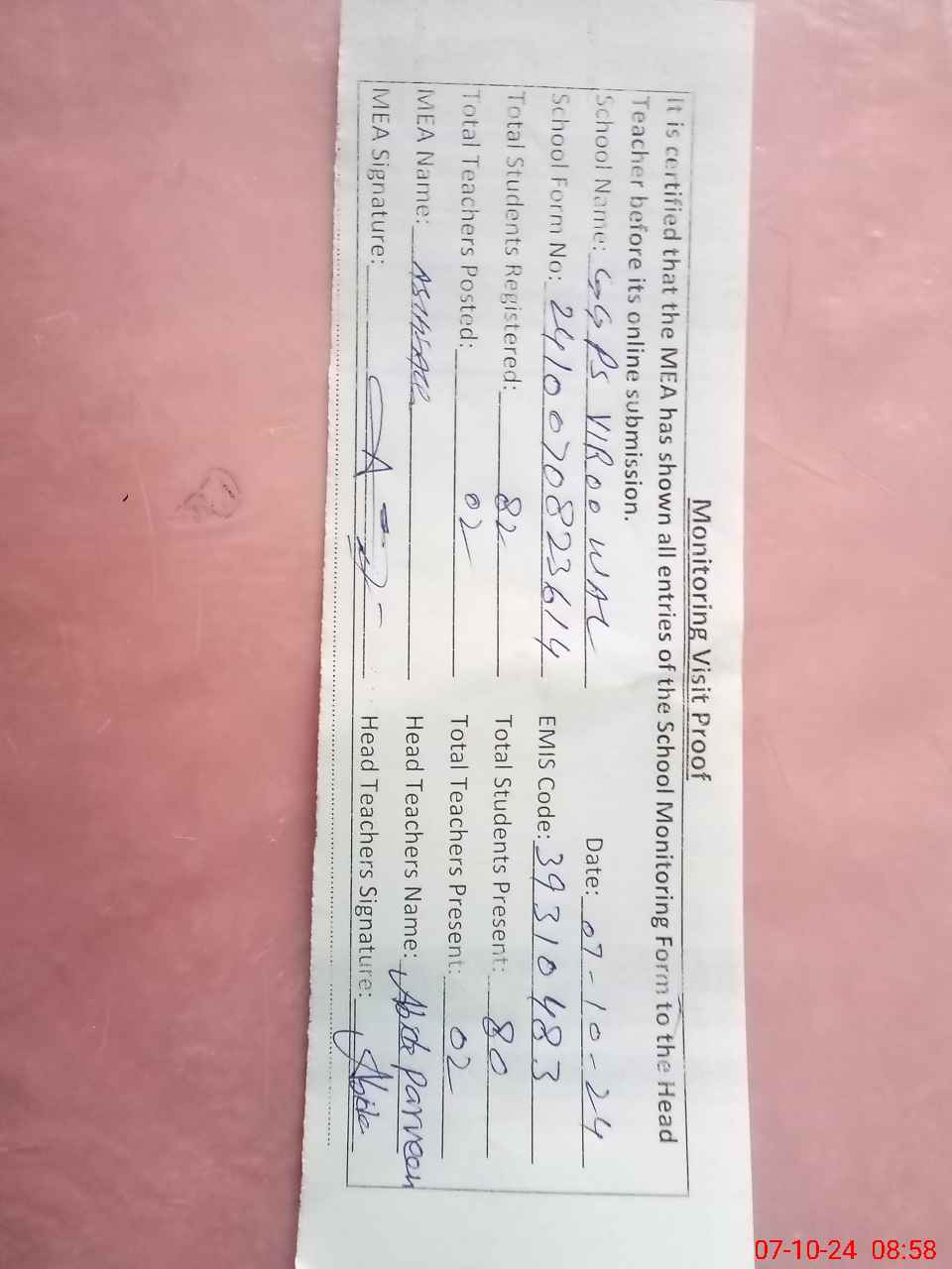 | Attendance Register | Head Teacher | MEA with School | Visit Proof |