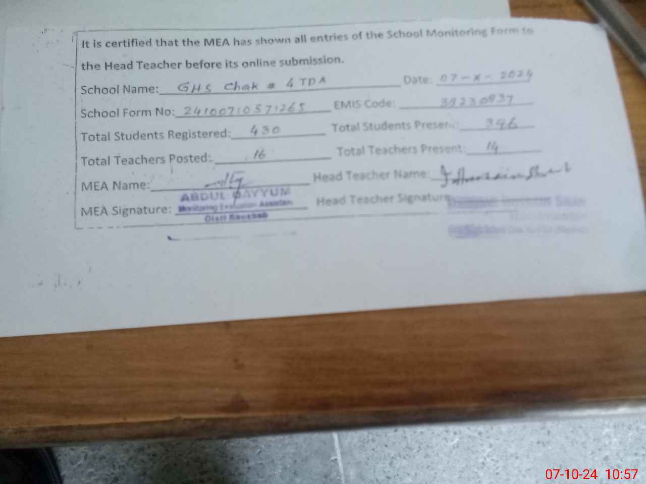 | EMIS Code: 38230837 | Name of School: GHS CHAK NO. 4 TDA | |||
