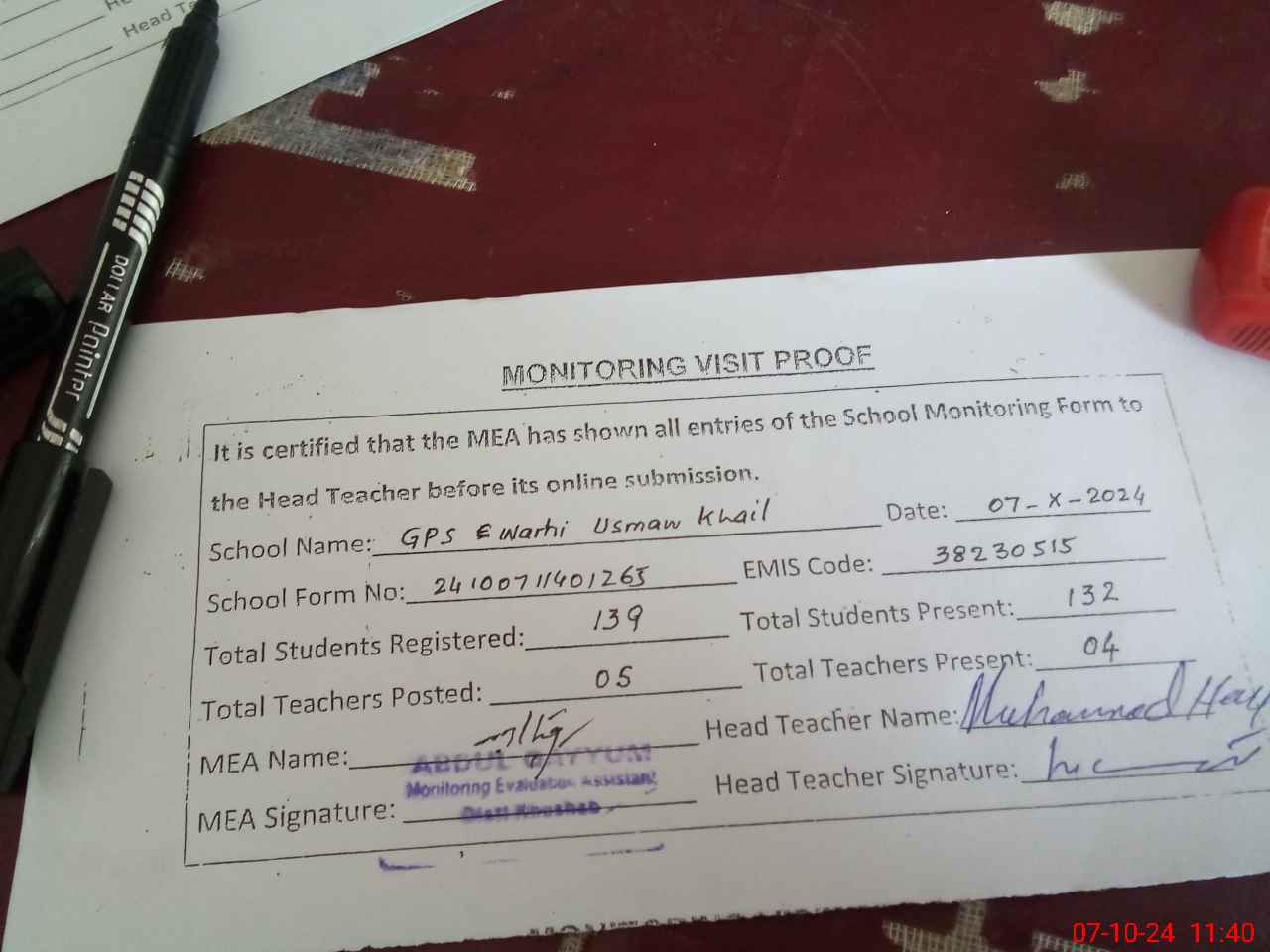 | Attendance Register | Head Teacher | MEA with School | Visit Proof |